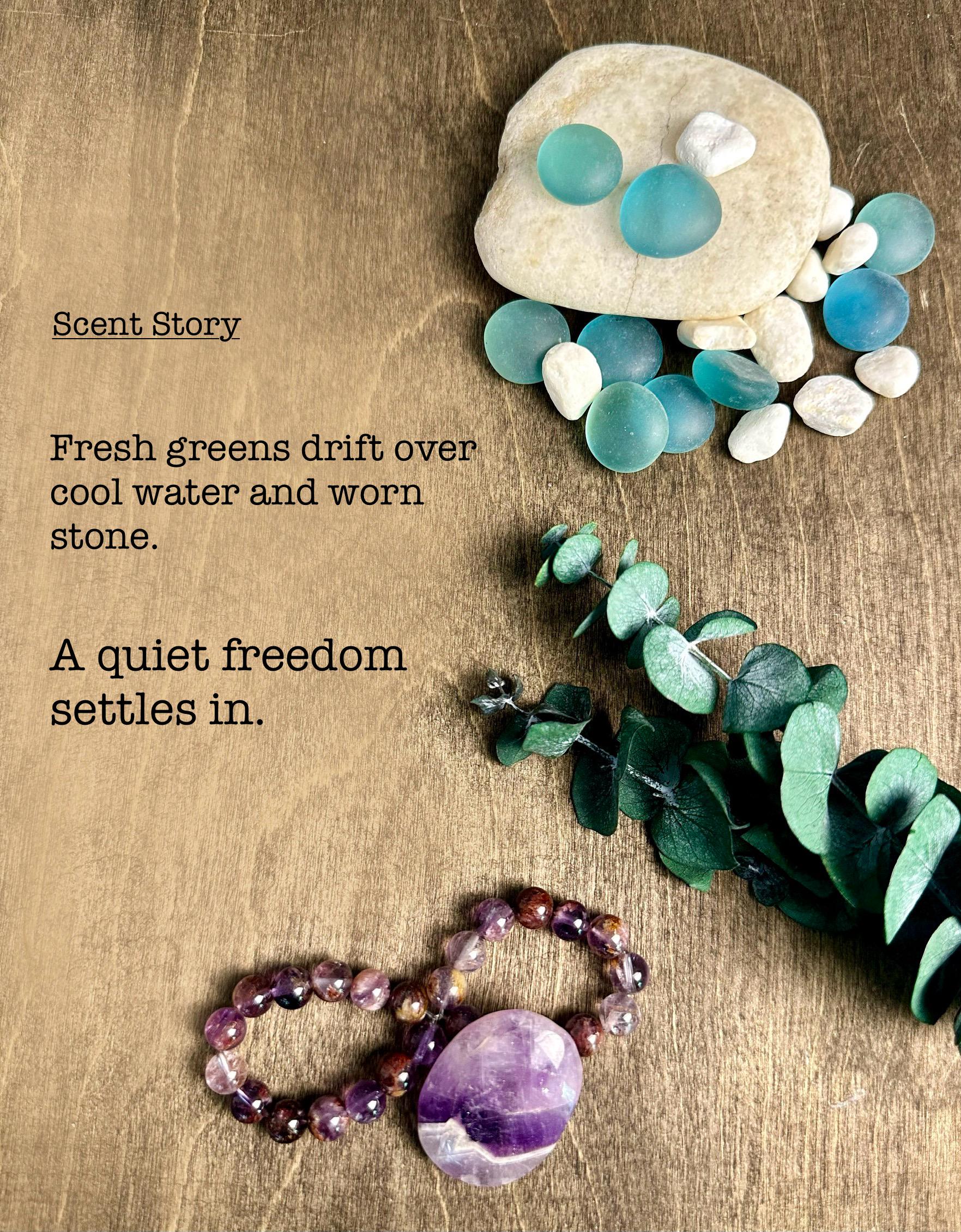 A cool, flowing blend of peppermint, fresh air, and eucalyptus leaves, softened by gentle herbs and light woods — like a quiet creek winding through the forest.